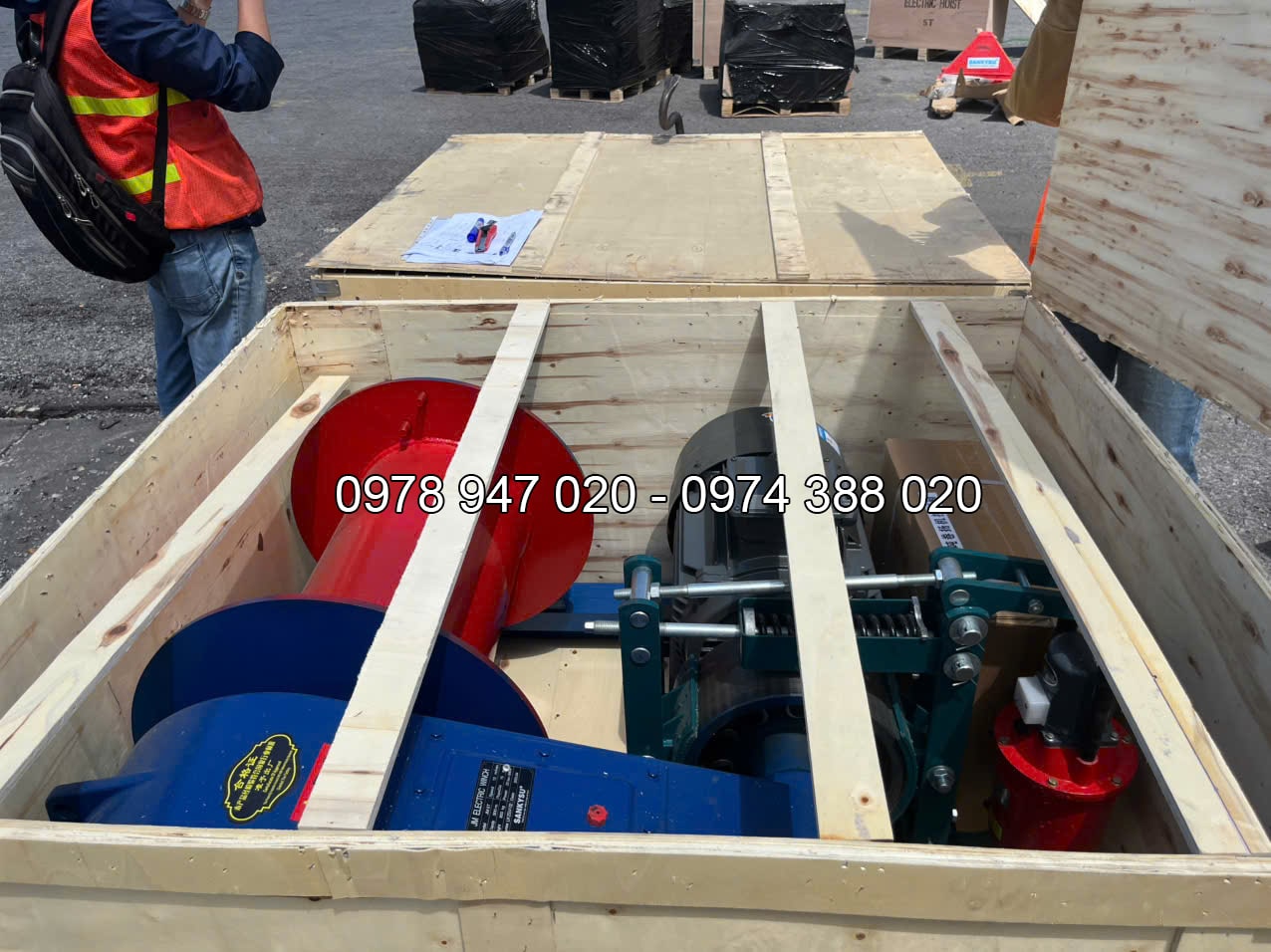 Động cơ kéo cáp quấn quanh trục tời. Cáp này sẽ được sử dụng để kéo vật liệu. Tốc độ nâng hạ đạt 12m/phút, giúp tiết kiệm thời gian và tăng năng suất công việc.