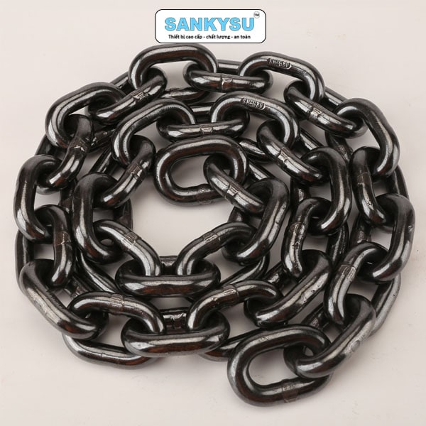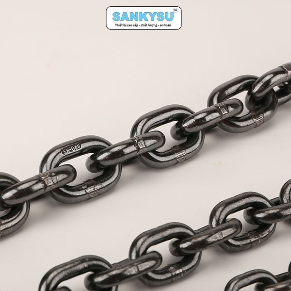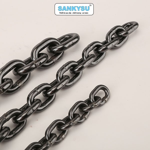 Xích được xử lý bề mặt (mạ kẽm hoặc xử lý nhiệt) giúp chống ăn mòn hiệu quả, kéo dài tuổi thọ ngay cả khi sử dụng trong điều kiện thời tiết ẩm ướt hoặc ngoài trời. - Tương thích với thiết bị nâng chuyên dụng:
